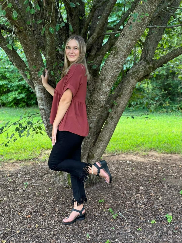 This is a babydoll top by the brand Entro. It comes in 2 colors (Black and Red-Brown) and sizes (M, L).